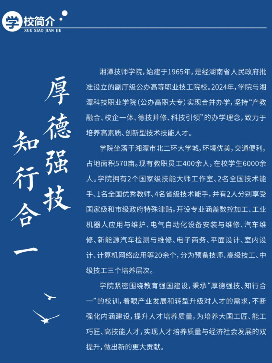 湘潭技師學(xué)院 招生專業(yè) 會計 電子商務(wù) 旅游服務(wù)與管理 物聯(lián)網(wǎng)應(yīng)用技術(shù) 平面設(shè)計 汽車營銷 室內(nèi)設(shè)計 數(shù)控加工 汽車維修 工業(yè)機器人應(yīng)用與維護 電氣自動化設(shè)備安裝與維修 3d打印技術(shù)應(yīng)用 新能源汽車檢測與維修 計算機網(wǎng)絡(luò)應(yīng)用 模具制造